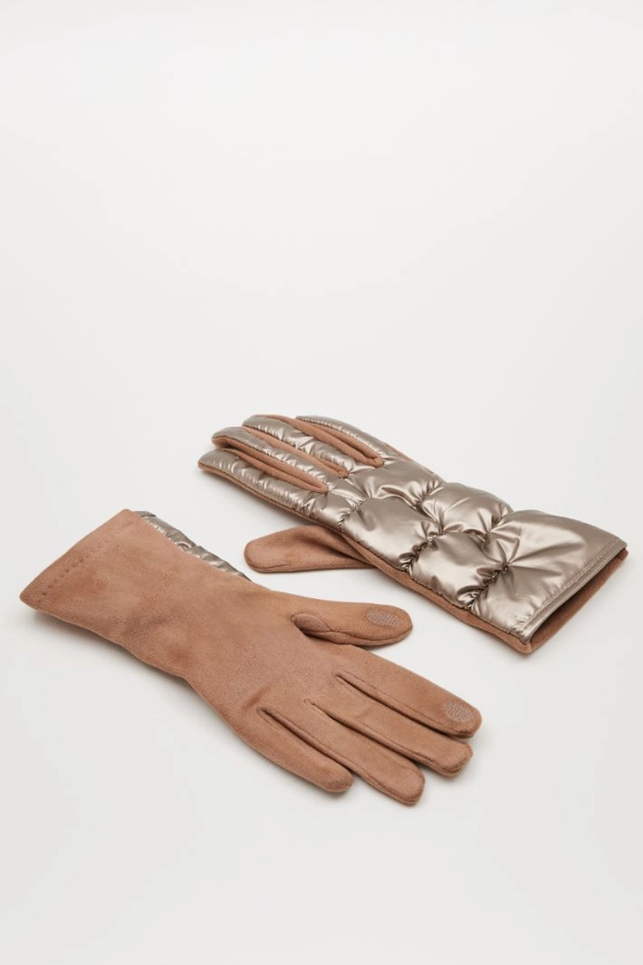 Gloves in suede-effect jersey, with quilted technical satin insert. Plush interior.