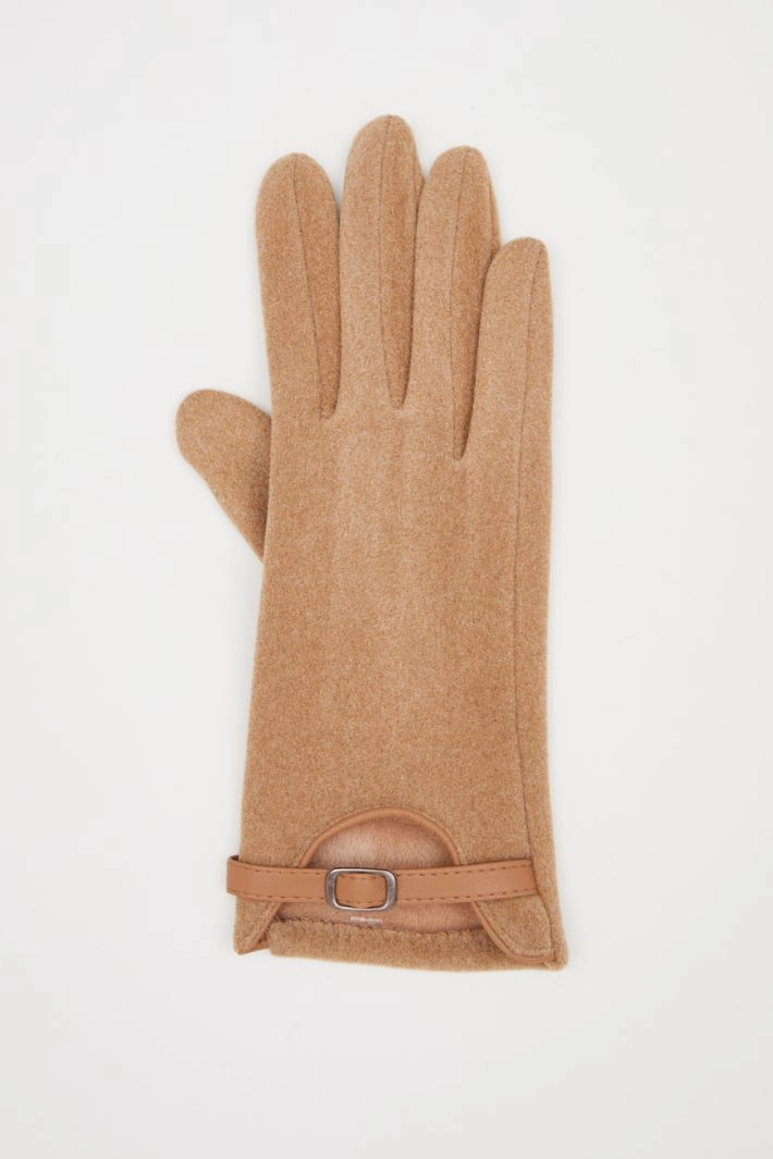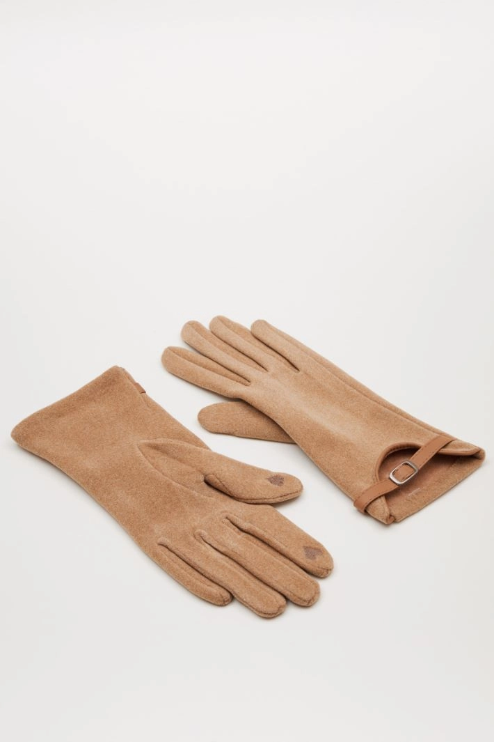 Gloves in stretch suede effect jersey, with faux leather strap detail. Plush interior.