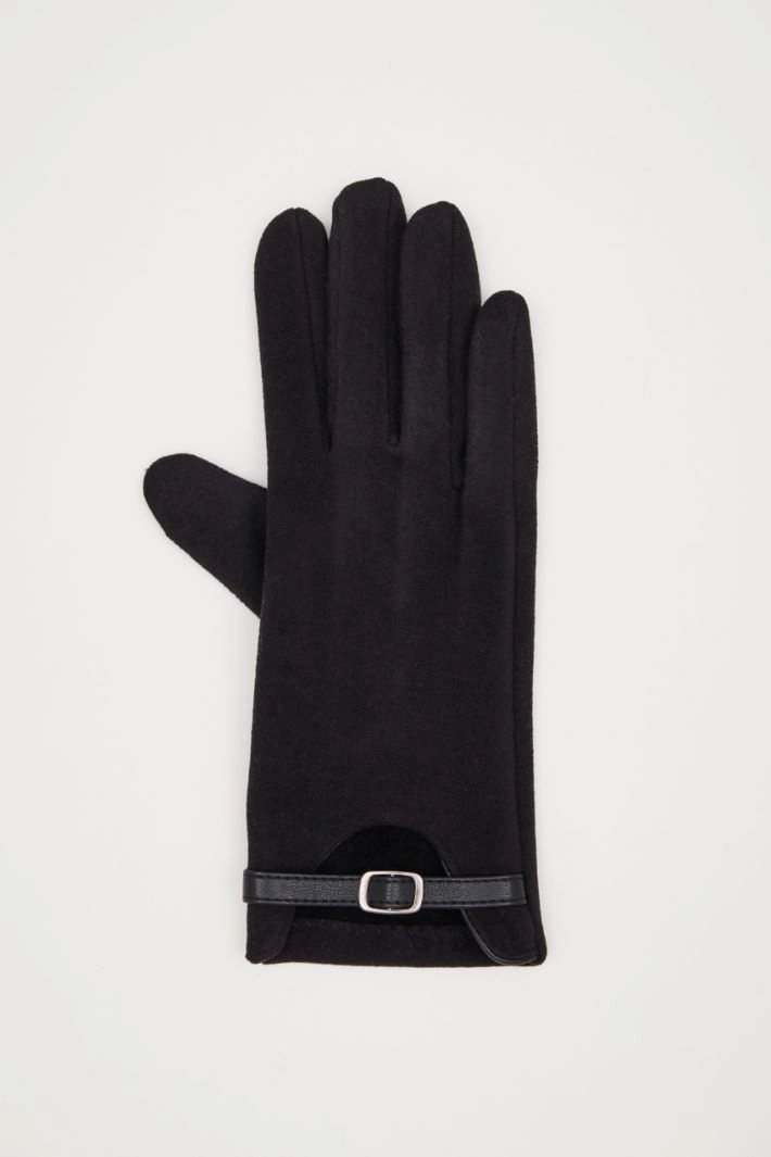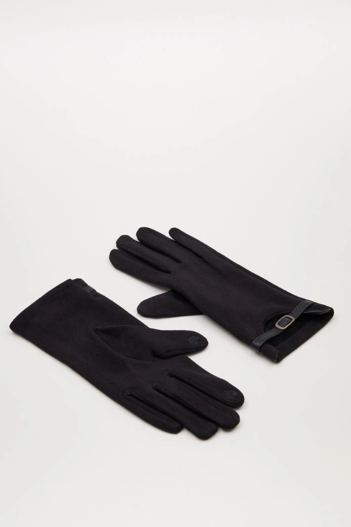 Gloves in stretch suede effect jersey, with faux leather strap detail. Plush interior.
