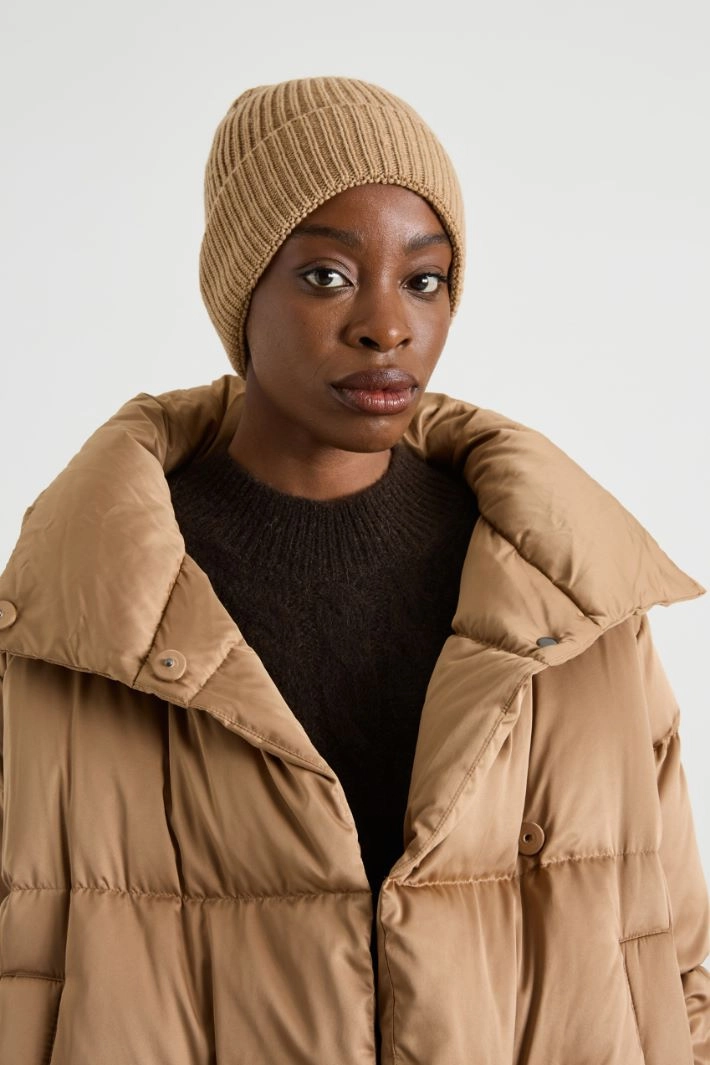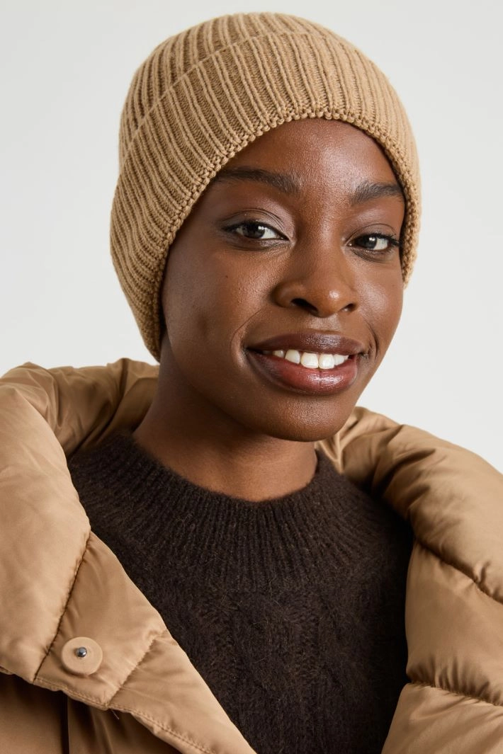 Hat in wool, viscose and cashmere yarn, with ribbed knit and turn-up.