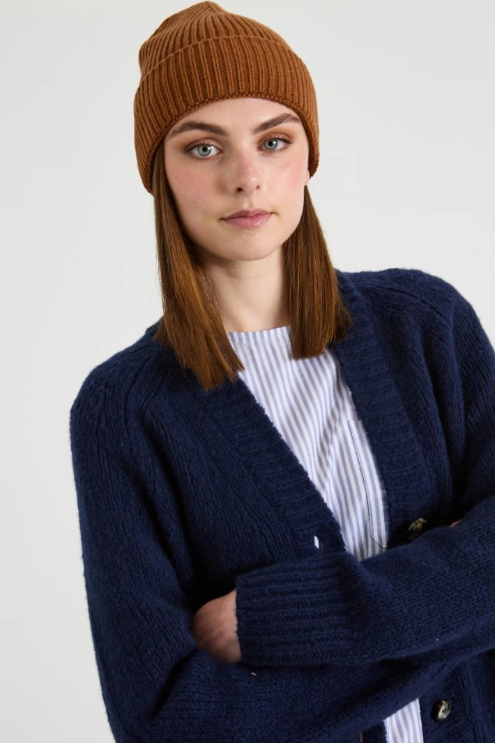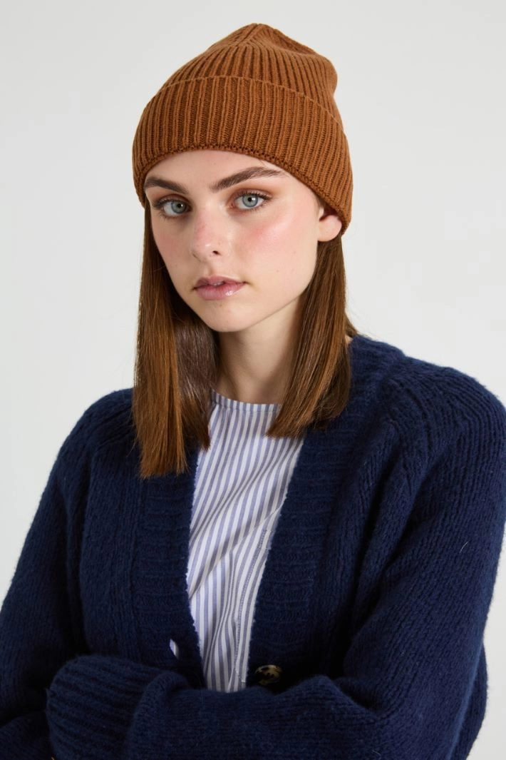 Hat in wool, viscose and cashmere yarn, with ribbed knit and turn-up.