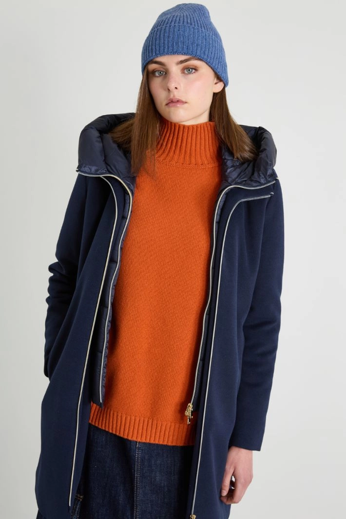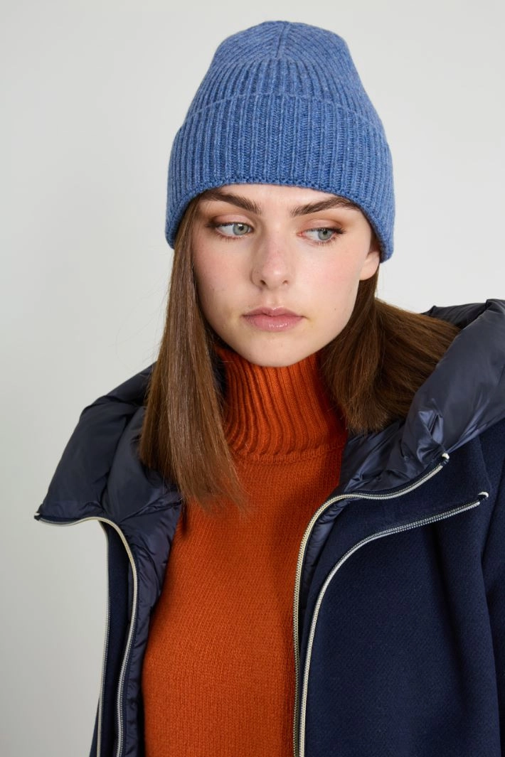 Hat in wool, viscose and cashmere yarn, with ribbed knit and turn-up.