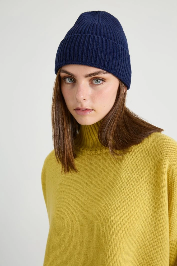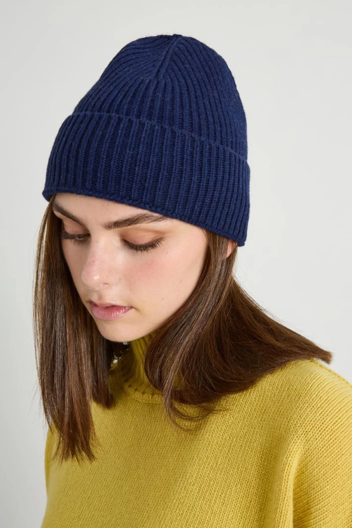 Hat in wool, viscose and cashmere yarn, with ribbed knit and turn-up.