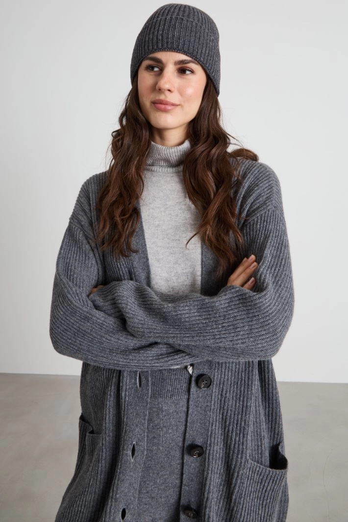 Hat in wool, viscose and cashmere yarn, with ribbed knit and turn-up.