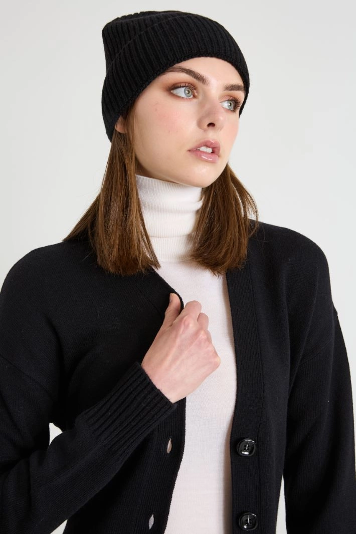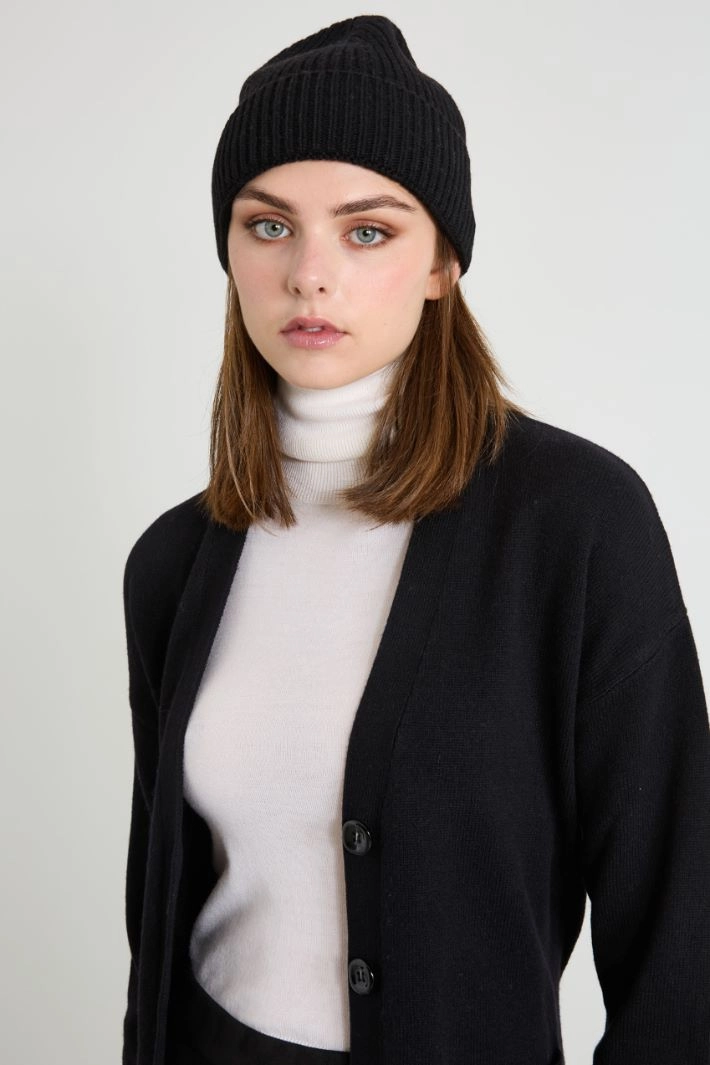 Hat in wool, viscose and cashmere yarn, with ribbed knit and turn-up.