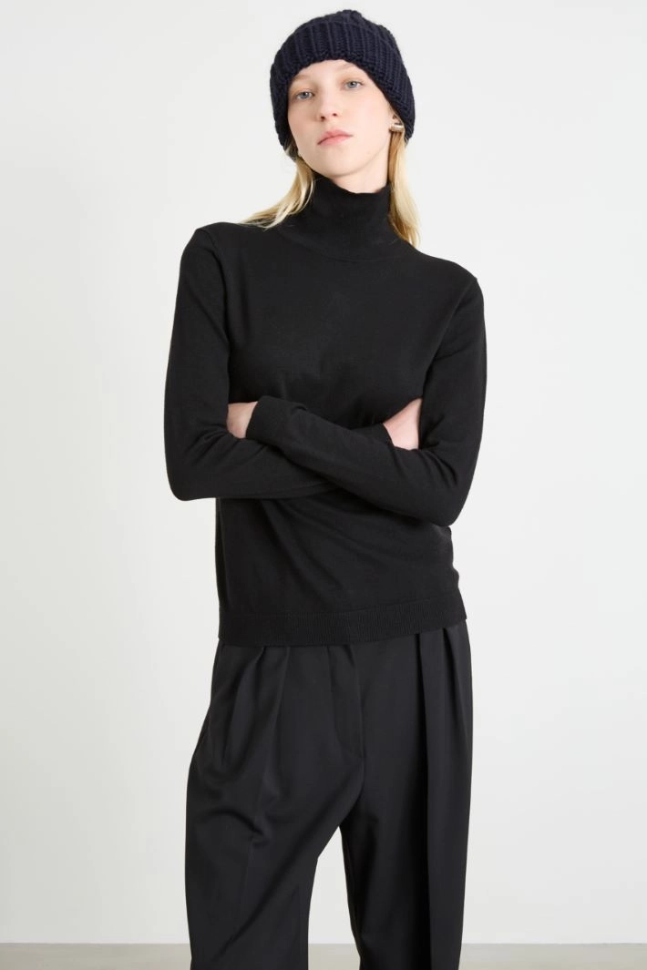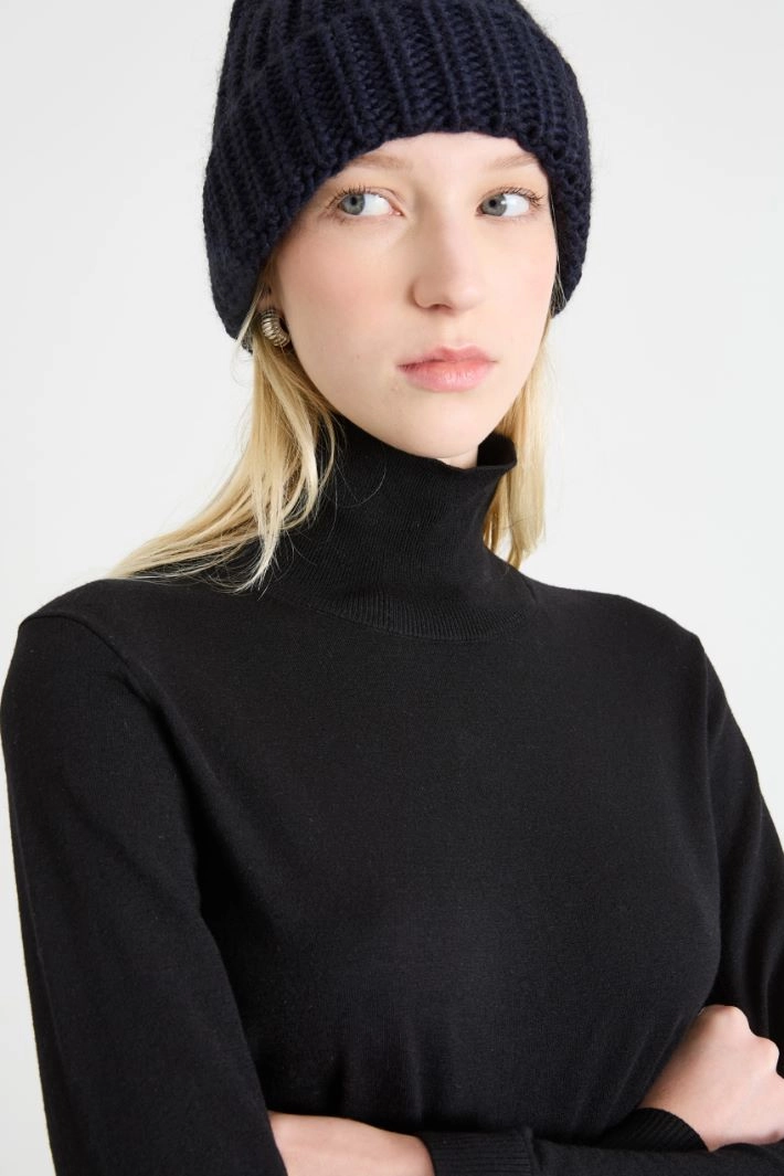 Hat in alpaca and wool yarn with wide ribbing and turn-up.