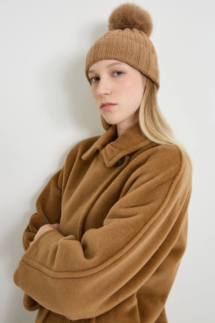 Ribbed wool blend yarn hat with turn-up and pom pom.