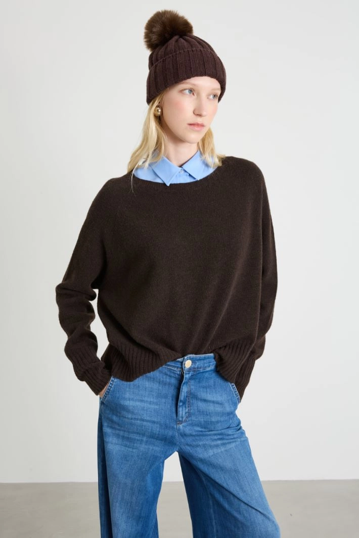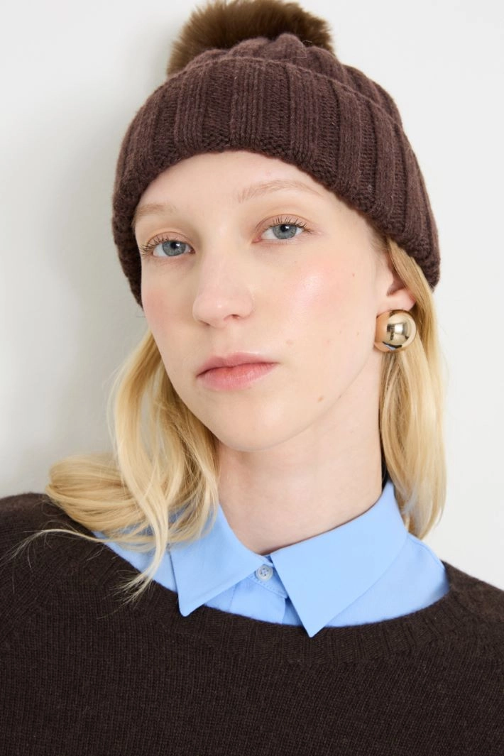 Ribbed wool blend yarn hat with turn-up and pom pom.