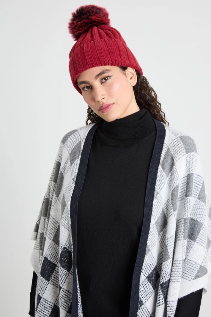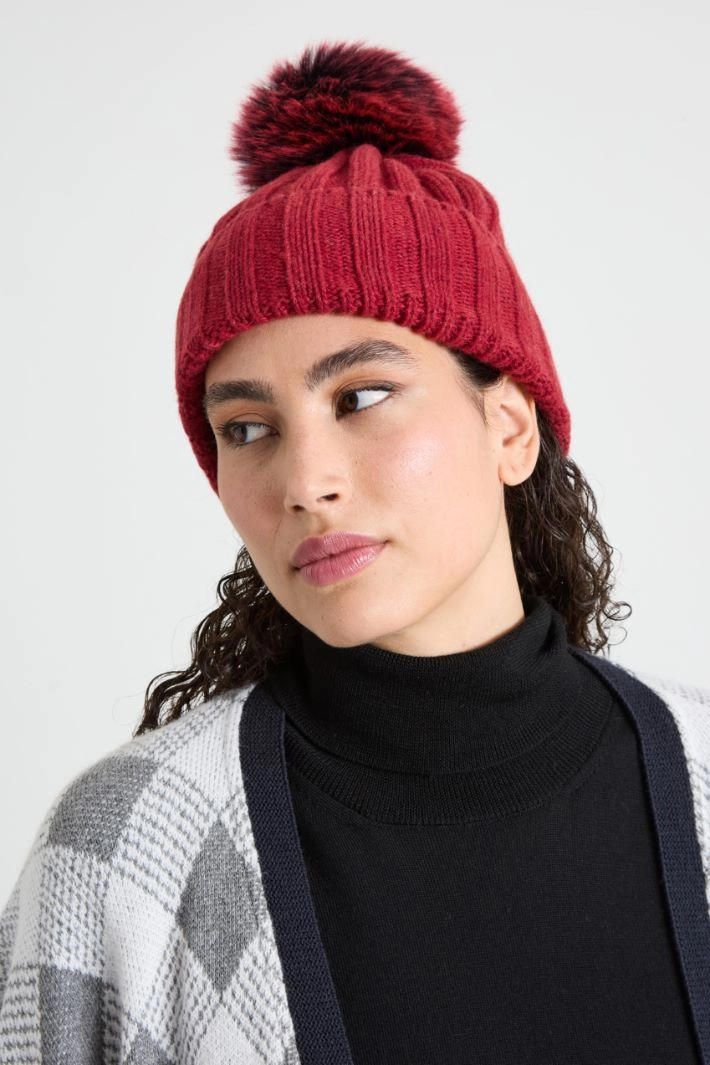 Ribbed wool blend yarn hat with turn-up and pom pom.