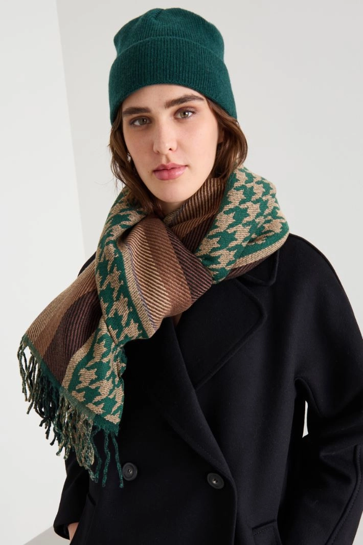 Hat in wool and viscose blend yarn with ribbed knit and turn-up.