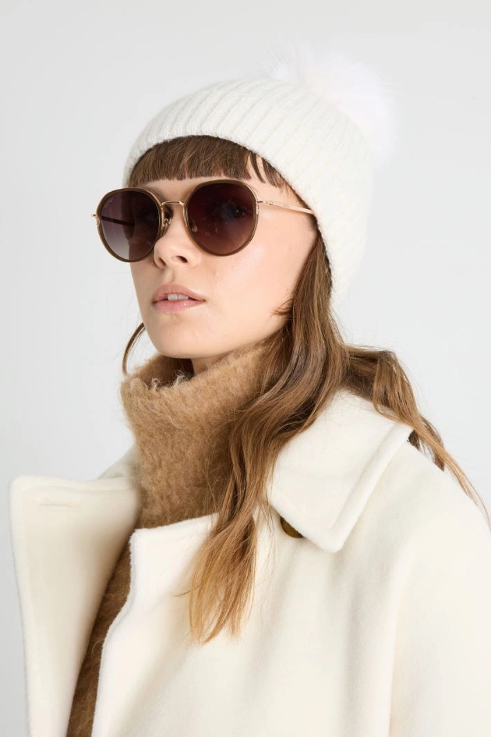 Hat in ribbed wool and viscose blend yarn, with lamé inserts, turn-up and pom pom.