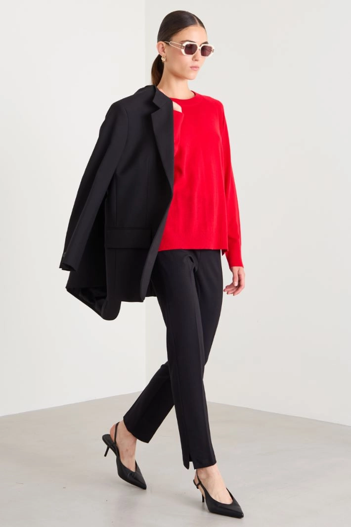 Slim trousers in viscose blend jersey, with elasticated waistband, crease along the length and side slits at the hem.