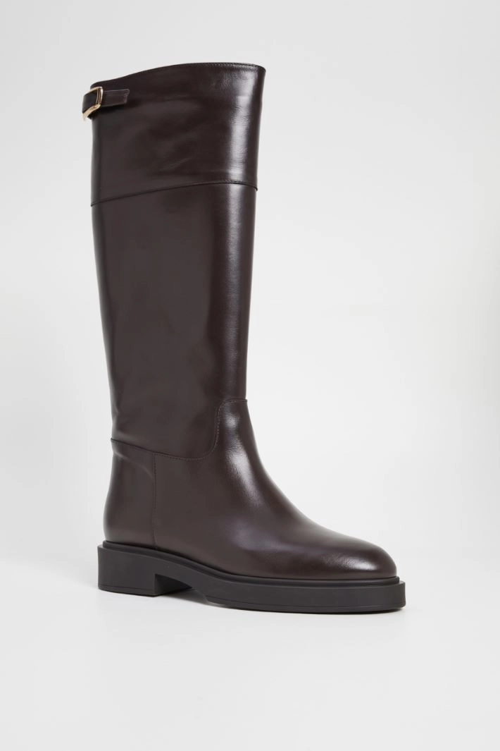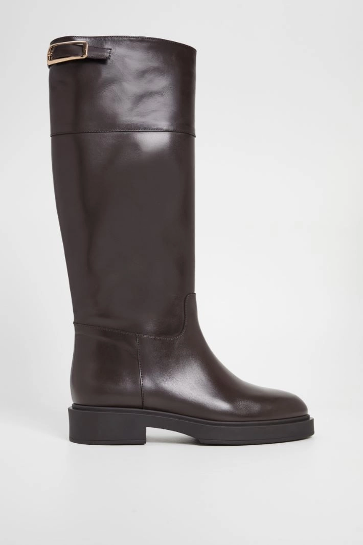 Boots in genuine leather, with buckle detail on the calf and rounded toe.