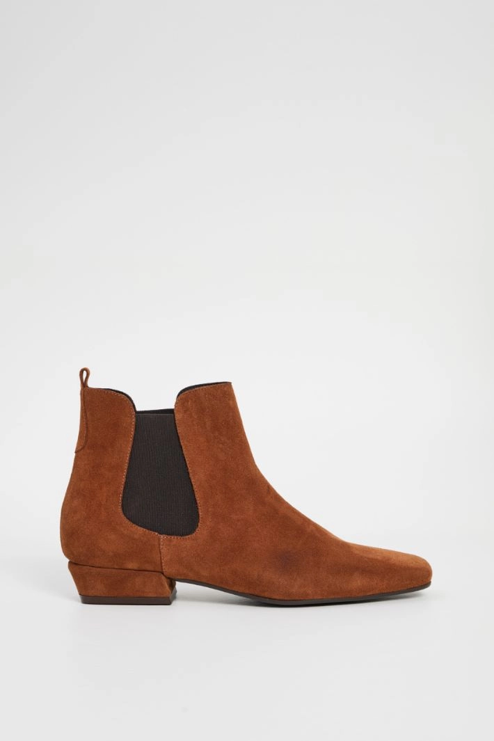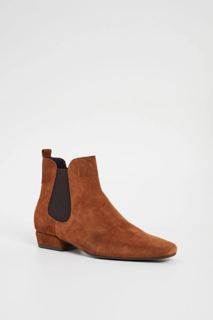 Ankle boots in genuine suede leather, with square toe and elastic inserts on the sides. Leather lining, rubber sole.