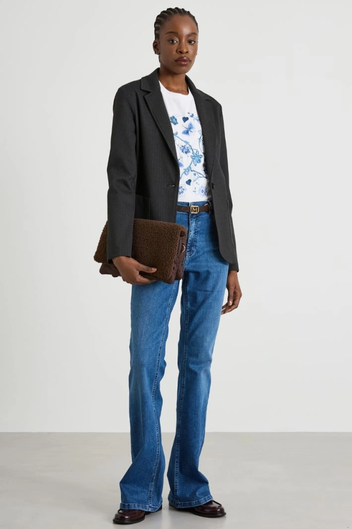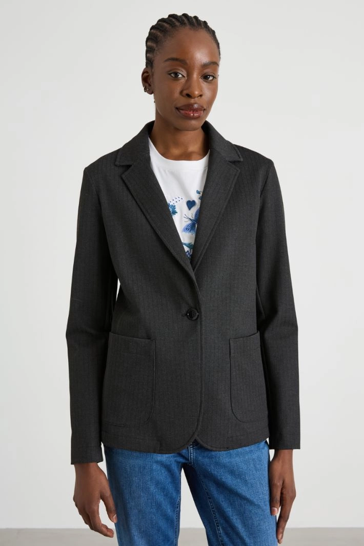 Slightly fitted blazer in yarn-dyed stretch viscose blend jersey, with lapel collar, long sleeves, side patch pockets and single-breasted button fastening. Unlined.