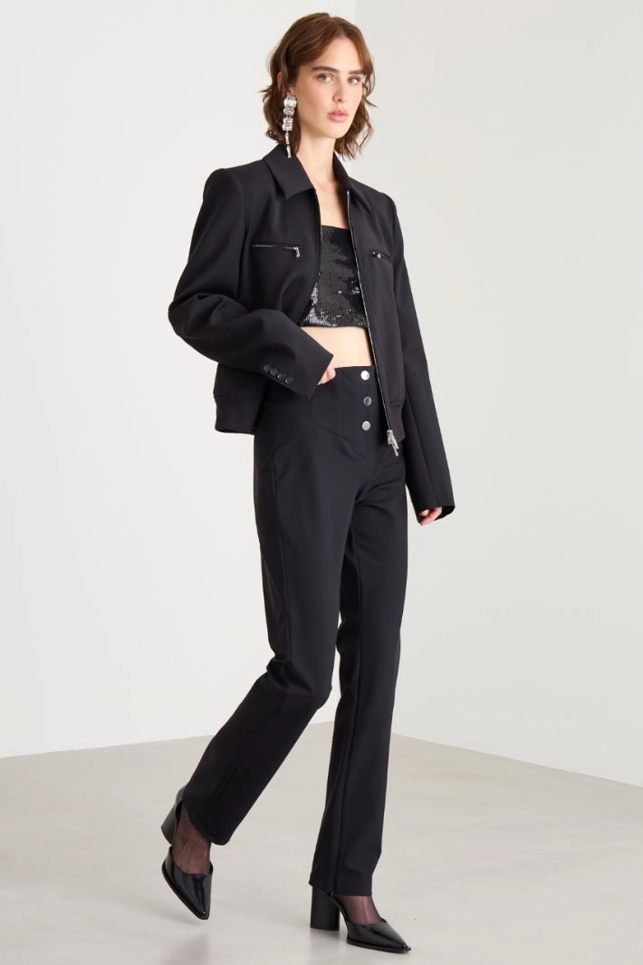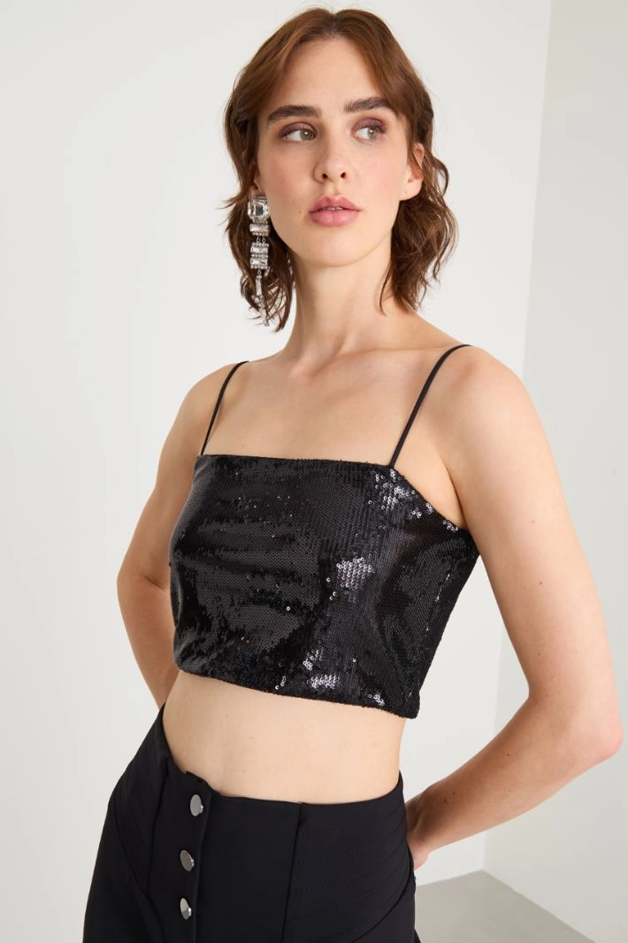 Semi-fitted cropped top in sequined jersey with a square neckline and thin shoulder straps. Lined.