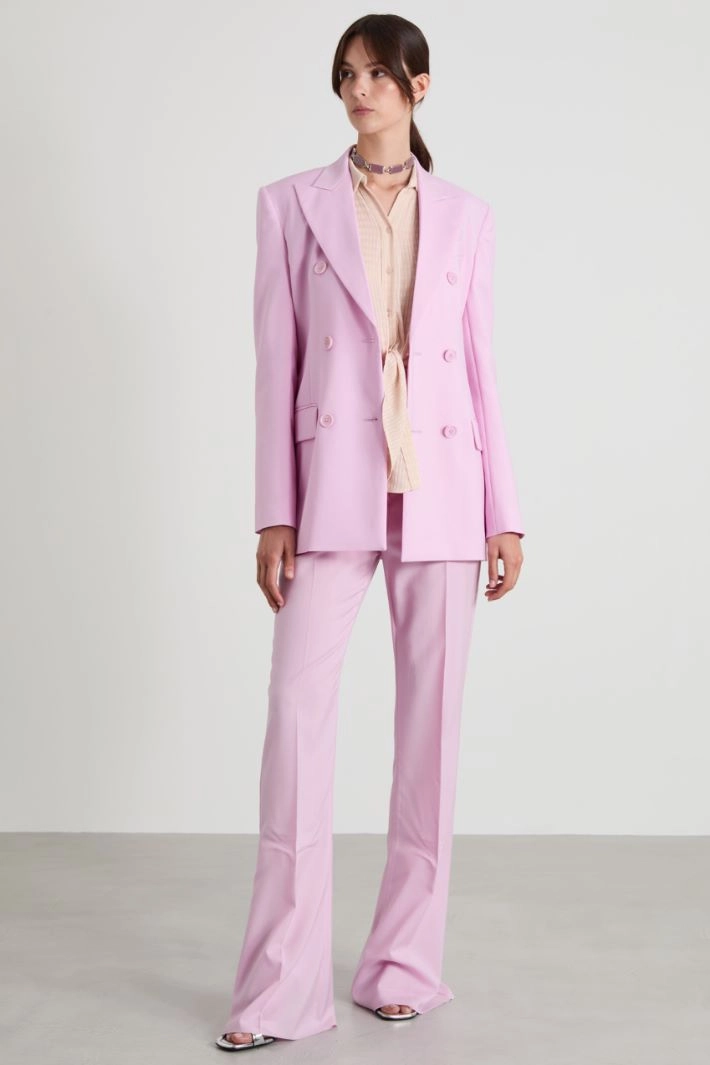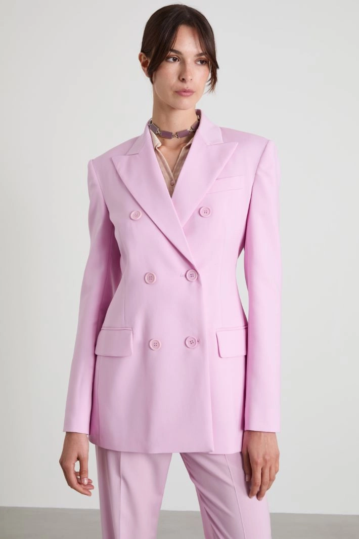 Fitted blazer in wool canvas, with peak lapel collar, long sleeves with buttons, chest pocket and double-welt side pockets with flap. Double-breasted fastening with buttons. Lined.