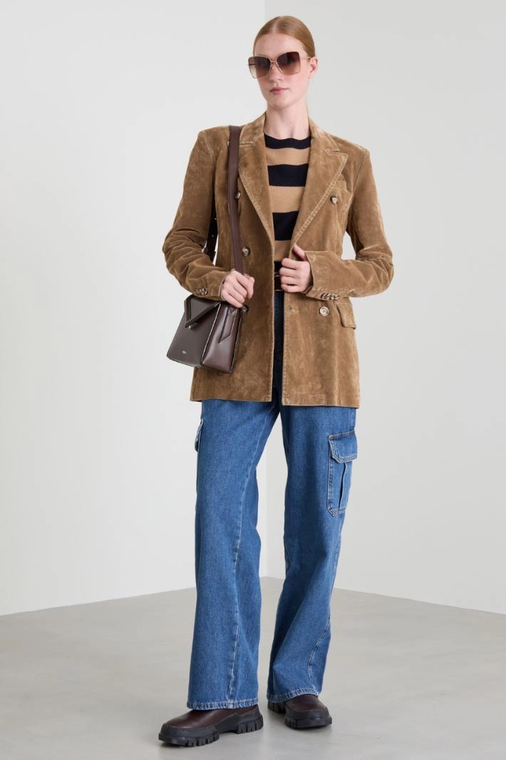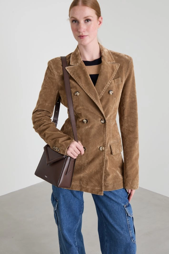 Fitted blazer in cotton velvet, with peak lapels, long sleeves with buttons and flap pockets. Double-breasted fastening with buttons. Lined.