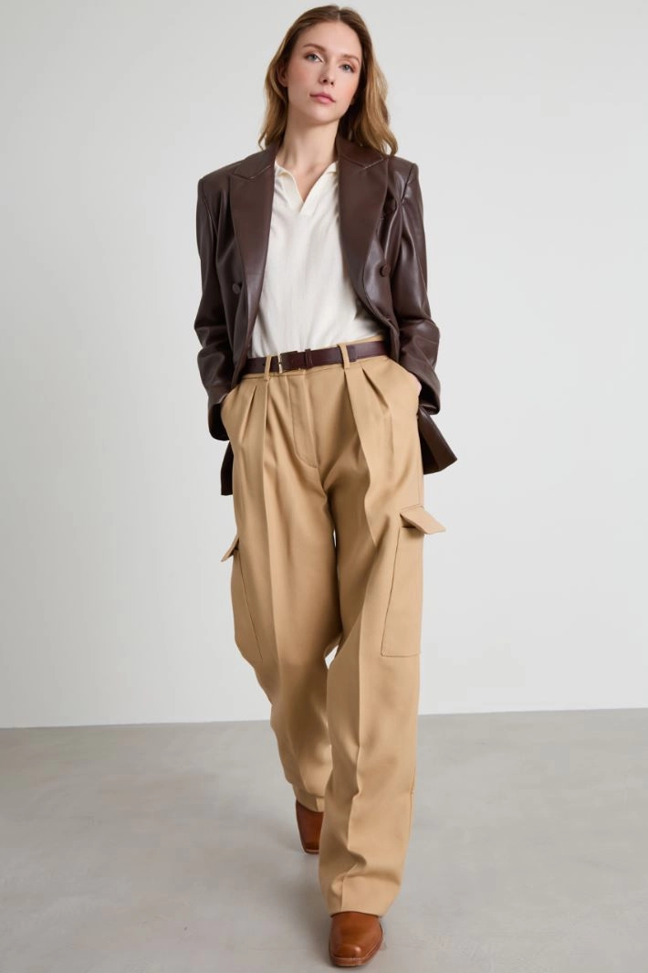 Low-waisted cargo trousers in double cotton and viscose fabric, with belt loops, darts sewn at the waist, crease ironed lengthwise, side French pockets and double welt pockets with flap on the back and along the leg. Hidden fastening with zip, button and hook.