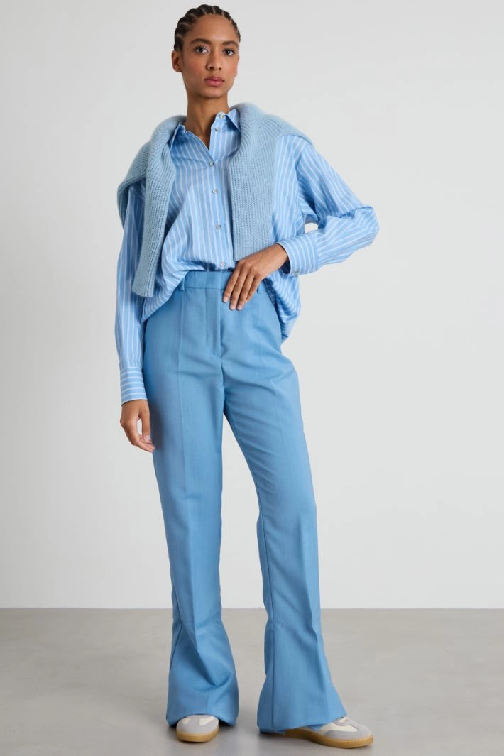 Flare trousers in wool and mohair blend canvas, with belt loops at the waist, French pockets at the front, welt pockets at the back and pressed crease along the length. Hidden fastening with zip, button and hook.