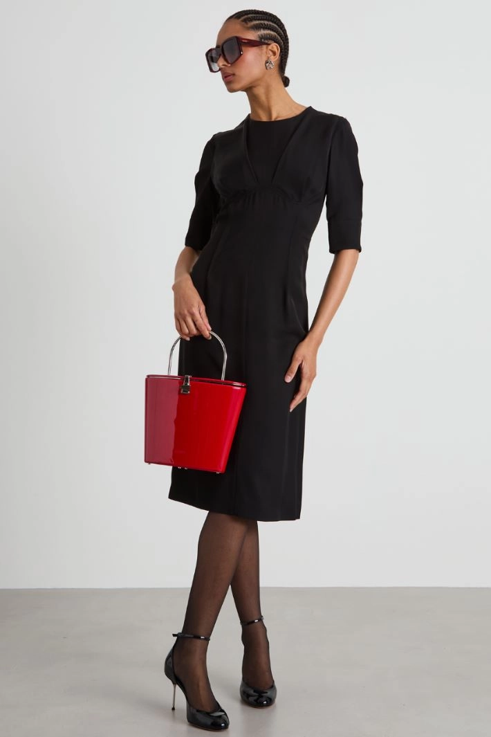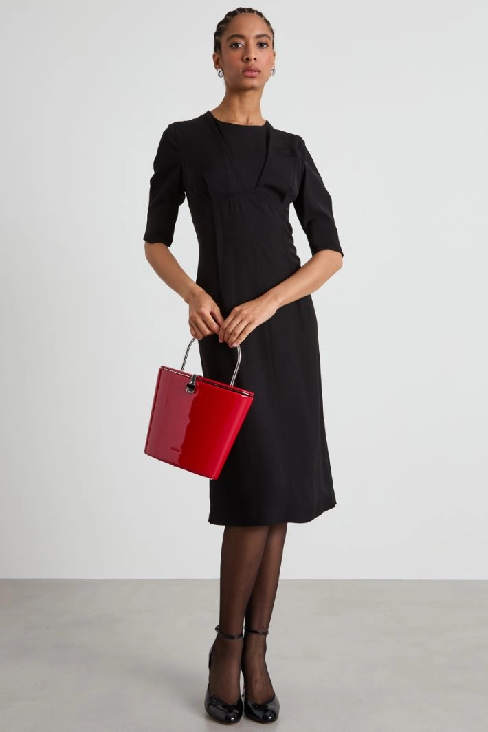 Slightly fitted dress in pure viscose satin with a washed effect, with a crew neck, short sleeves with cuffs and buttons, darts at the waist sewn on the outside and a central slit at the back. Invisible zip fastening at the back. Partially-lined.