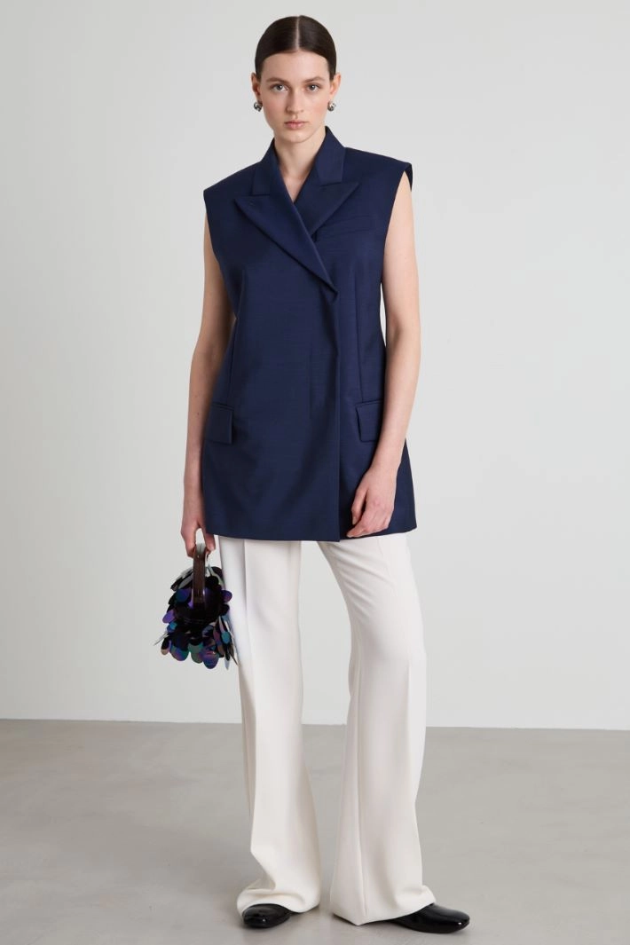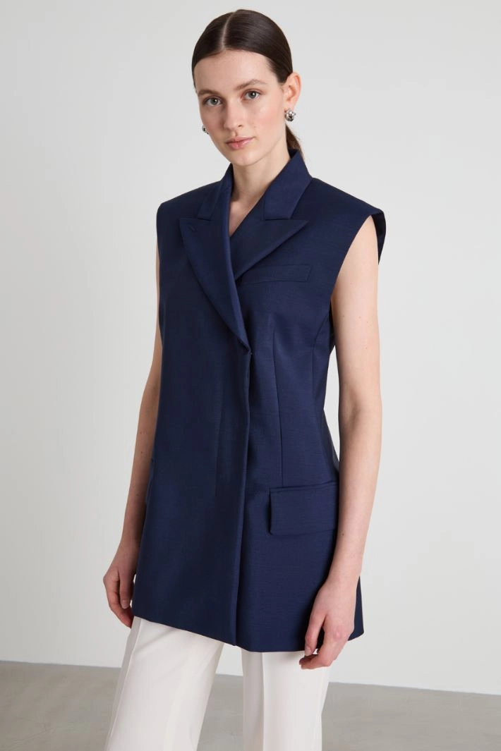 Sleeveless fitted blazer in wool blend canvas, lapel collar with melton undercollar, broad and padded shoulders, diagonal breast pocket and double-welt pockets with flap on the sides and double-breasted fastening. Lined, with central rear vent.