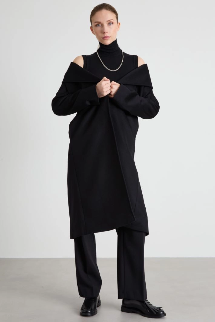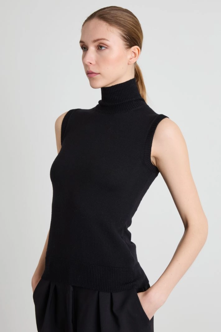 Regular-fit sleeveless turtleneck in pure wool yarn, with a high neck and ribbed ends.