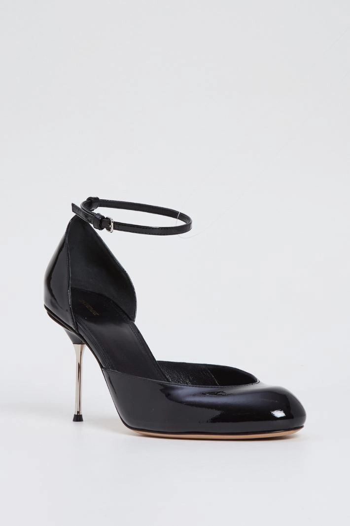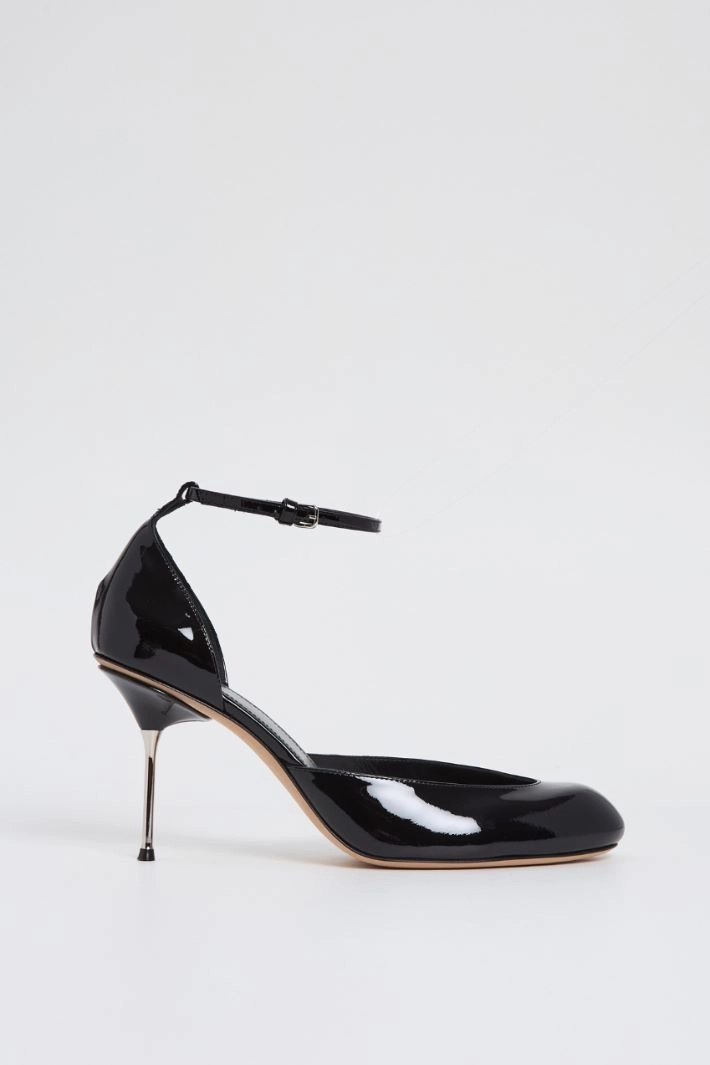 Pumps in genuine leather with a patent finish, with a deep neckline and rounded toe. Ankle fastening with an adjustable buckle strap, and thin metal heel. Leather lining, leather sole.