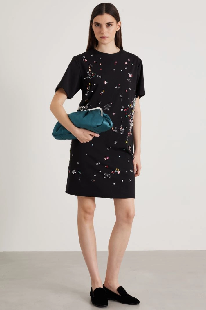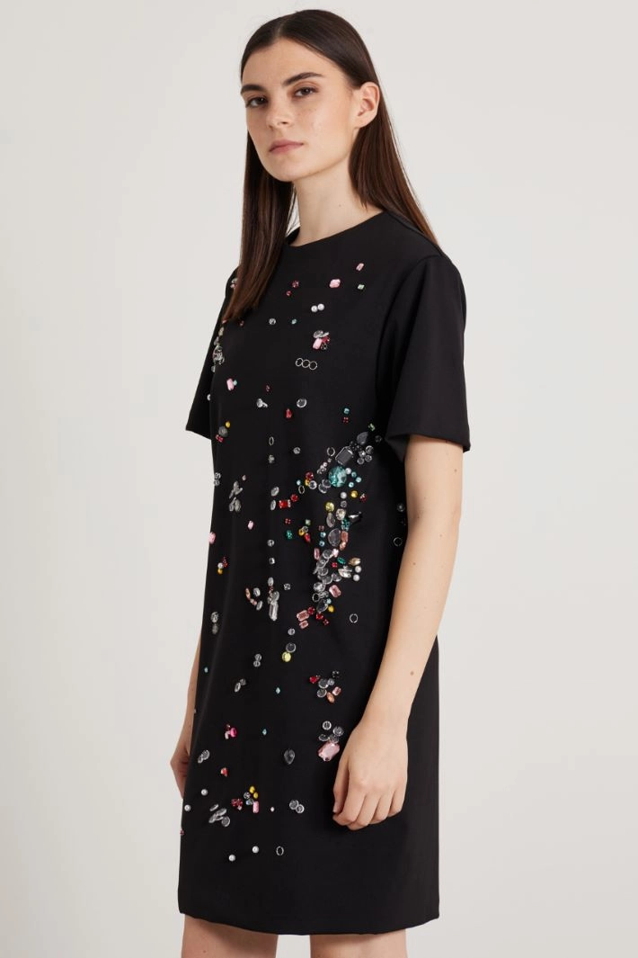 Straight-cut dress in double technical jersey, with crew neck, short sleeves and embroidered crystal motif on the front. Invisible zip fastening on the center back.