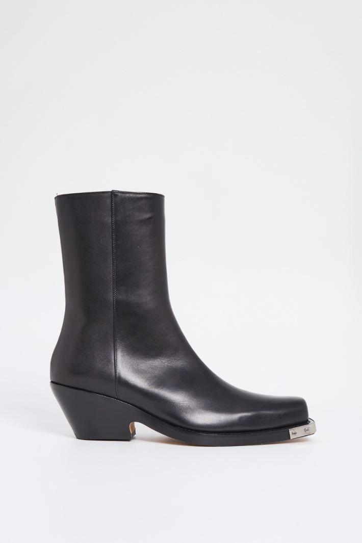 Cowboy boots in genuine leather with a shiny finish, square toe finished with metal detail and trapezoid heel. Zip fastening on the inside. Leather lining and leather sole.