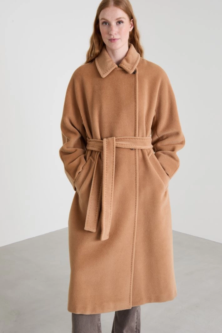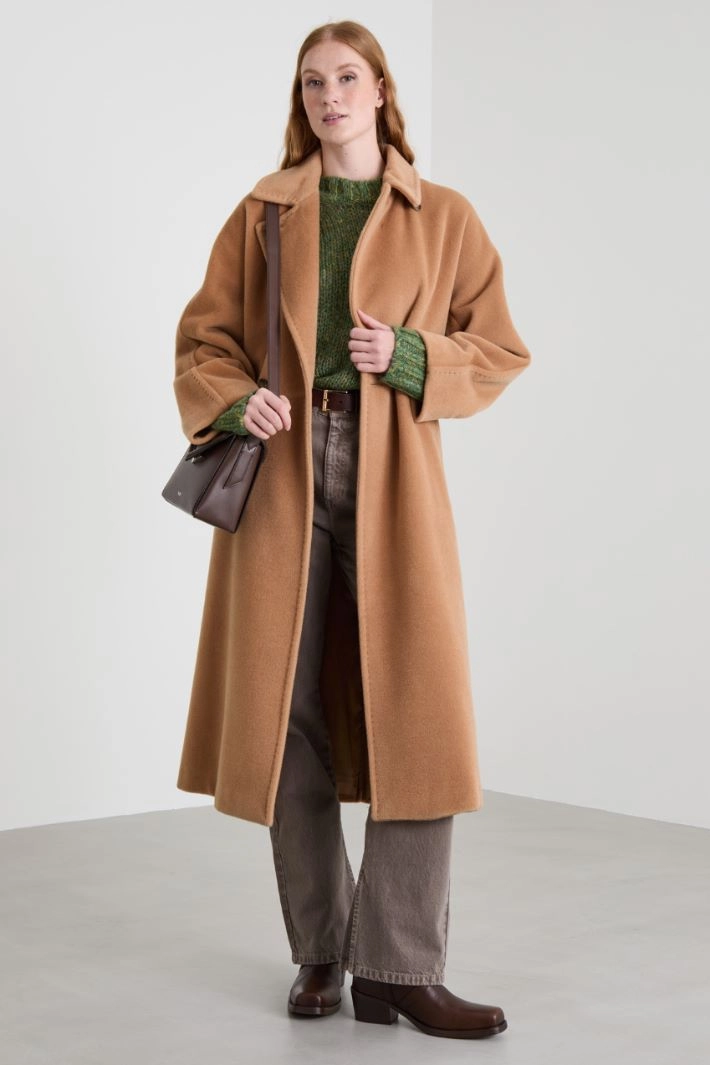 Straight-fit coat in pure wool beaver with a topstitched detail, lapel collar, long sleeves, welt pockets and a central vent on the back. Double-breasted fastening with buttons. Matching belt. Lined.