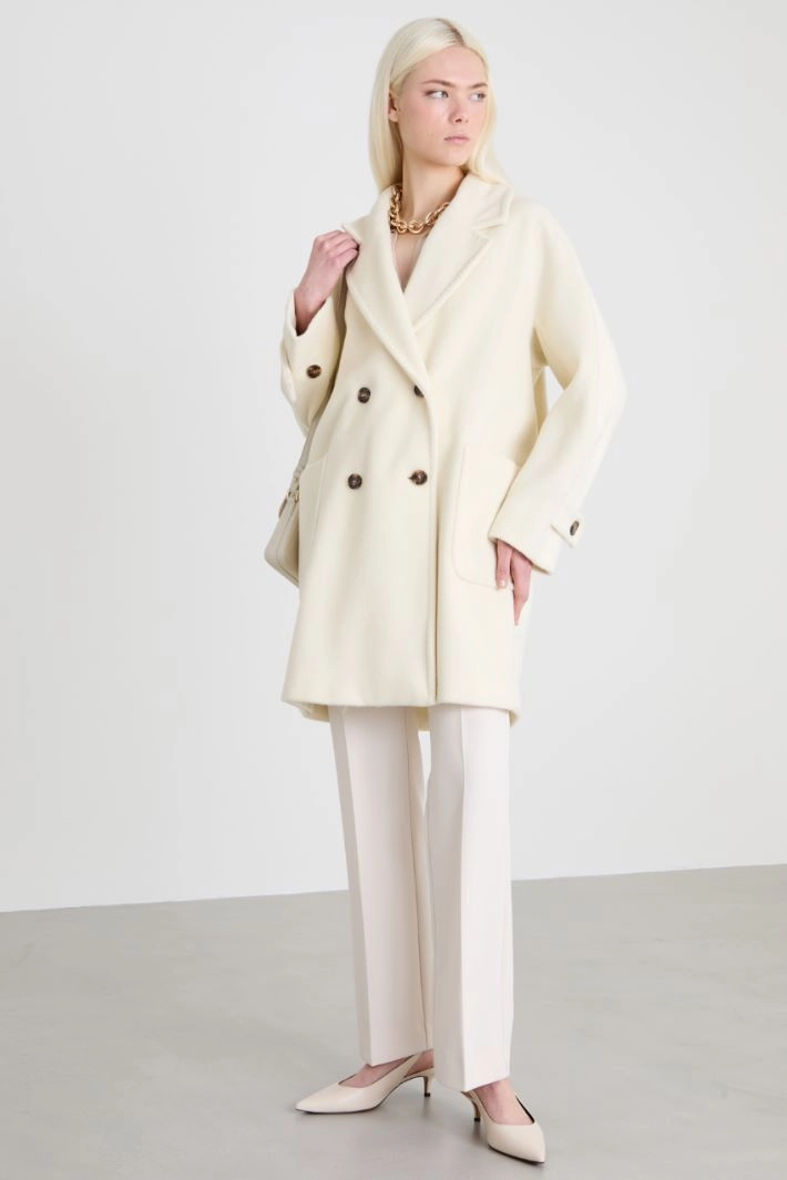 Straight-fit coat in pure wool beaver, with matching dot trim, lapel collar, long kimono sleeves with toggle and side patch pockets. Central vent on the back and double-breasted fastening with buttons. Lined.