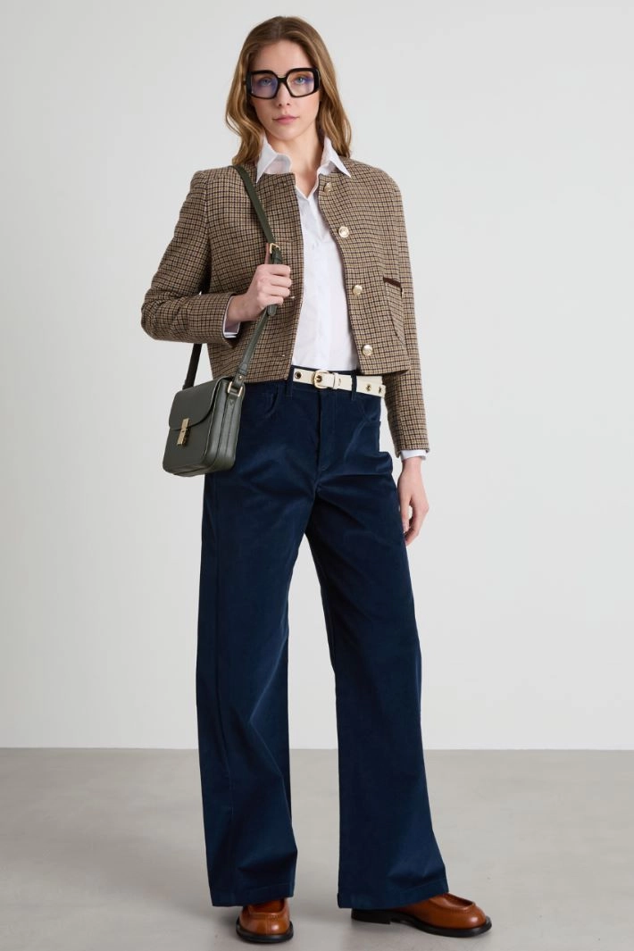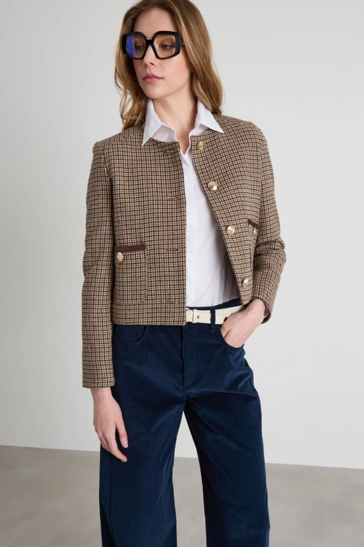 Short straight-fit jacket in wool blend batavia, with round neckline, long sleeves, patch pockets with jewel button and velvet details. Closure with jewel buttons. Lined.