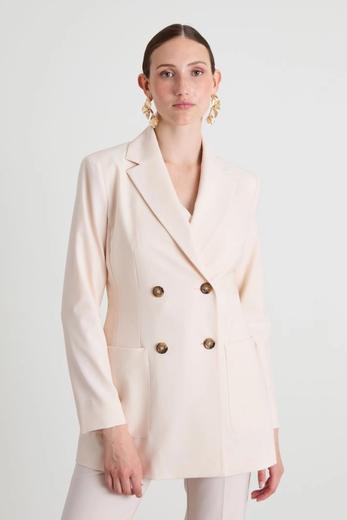 Slightly fitted blazer in stretch wool blend canvas, with lapel collar, long sleeves and side patch pockets. Double-breasted button fastening. Lined.