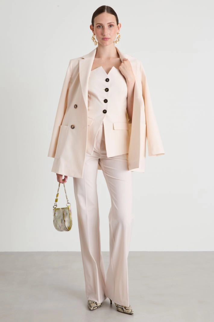 Fabric 53% polyester, 43% virgin wool, 4% elastane; lining 64% acetate, 36% polyester.