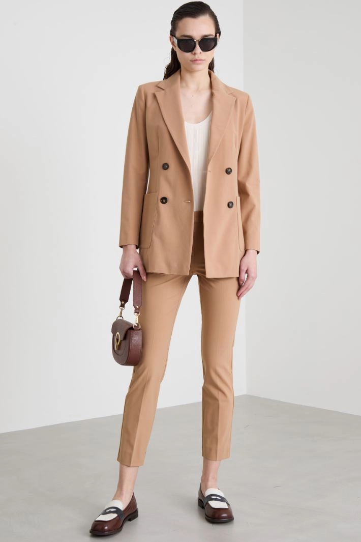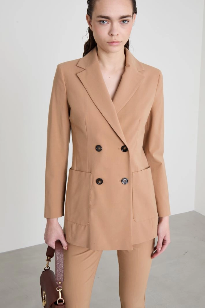 Slightly fitted blazer in stretch wool blend canvas, with lapel collar, long sleeves and side patch pockets. Double-breasted button fastening. Lined.