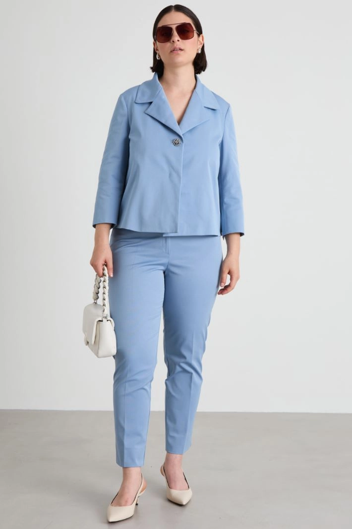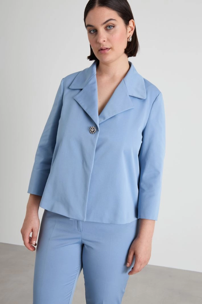 Slightly flared faille jacket with wide lapel collar, three-quarter sleeves and fastening with jewel button and snap button. Lined.