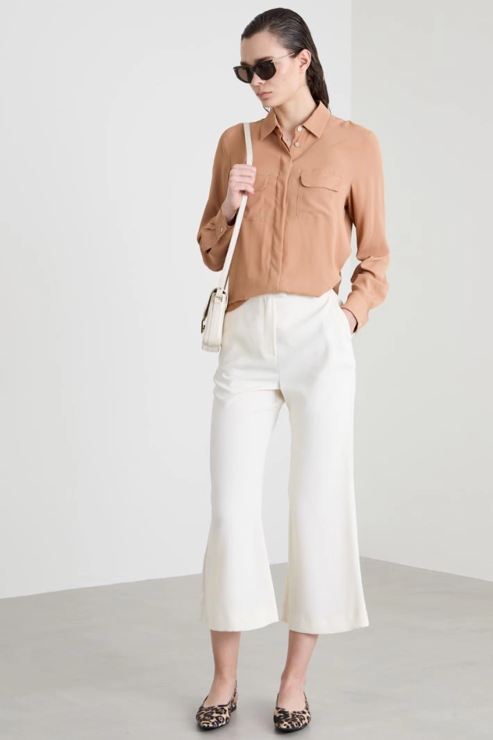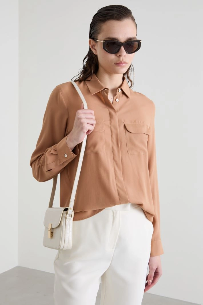 Flowing shirt in silk blend crepe de chine, with shirt collar, long sleeves with cuff and button, and chest pockets with flap. Yoke cut with box pleat on the back and hidden button fastening.