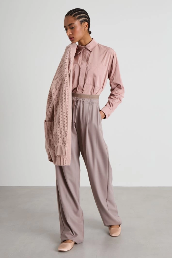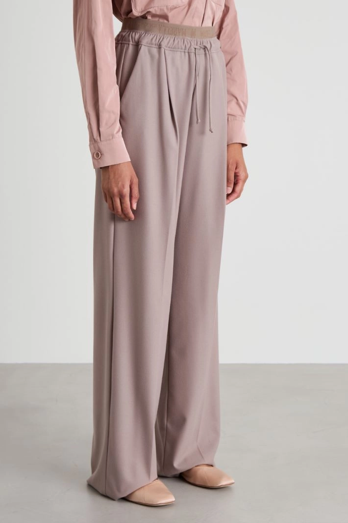 Loose-fit trousers in stretch viscose blend flannel, with drawstring waist and elastic insert, French side pockets and double welt pockets on the back, and crease pressed lengthwise.