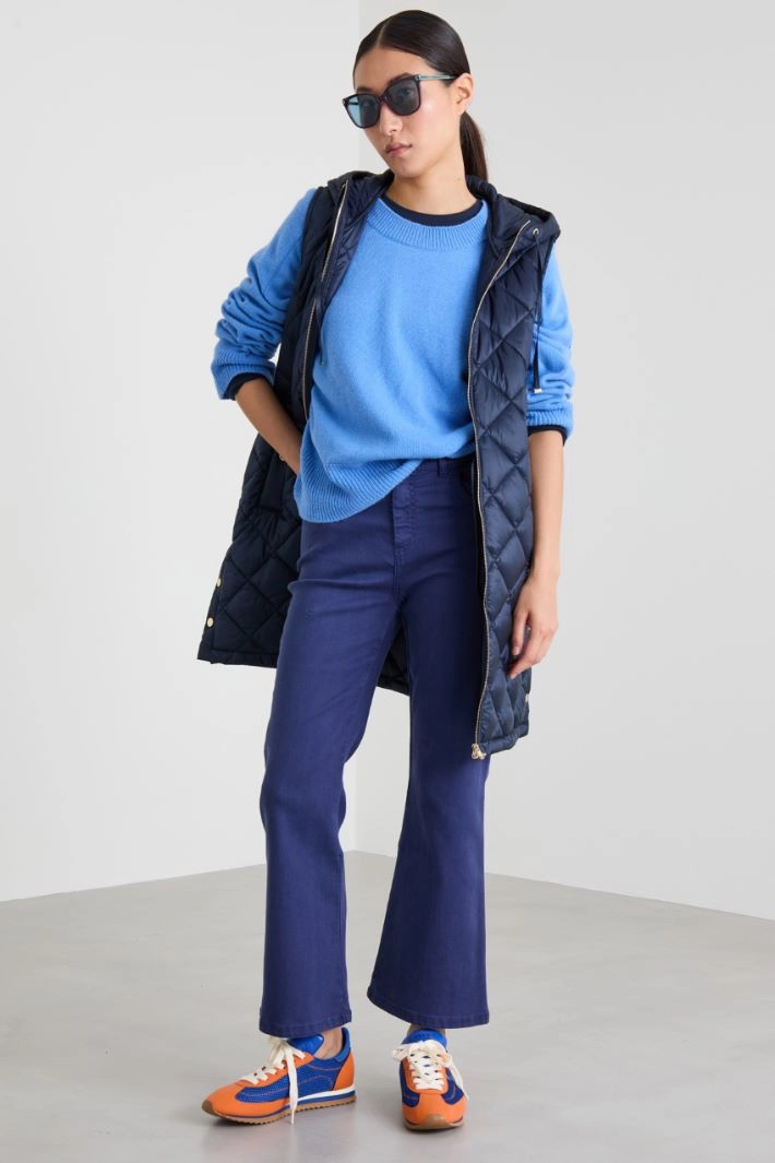 Flare trousers in natural fibres and stretch cotton, with belt loops at the waist, five pockets and fastening with a hidden zip and metal button.