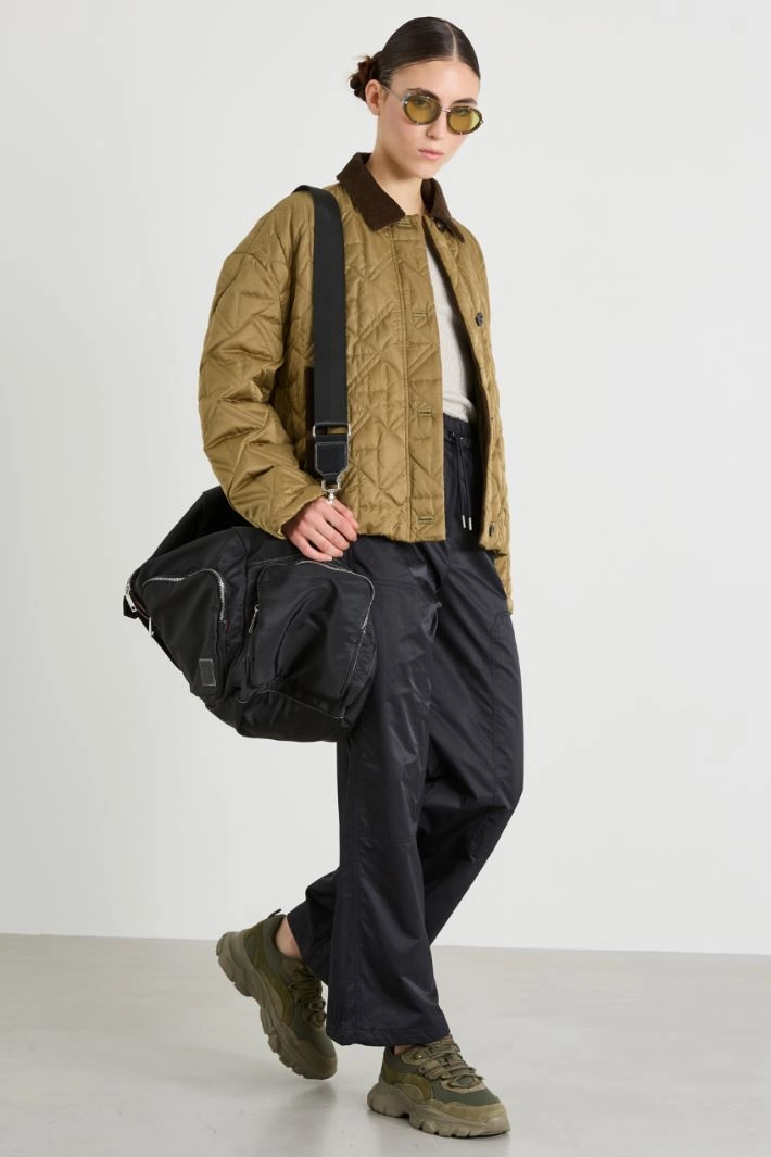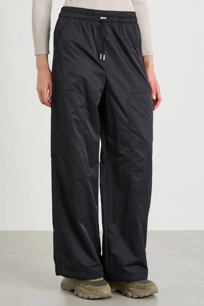 Straight-cut cargo trousers in technical satin, with drawstring waist and bottom, side French pockets and patch pockets on the back and along the leg.