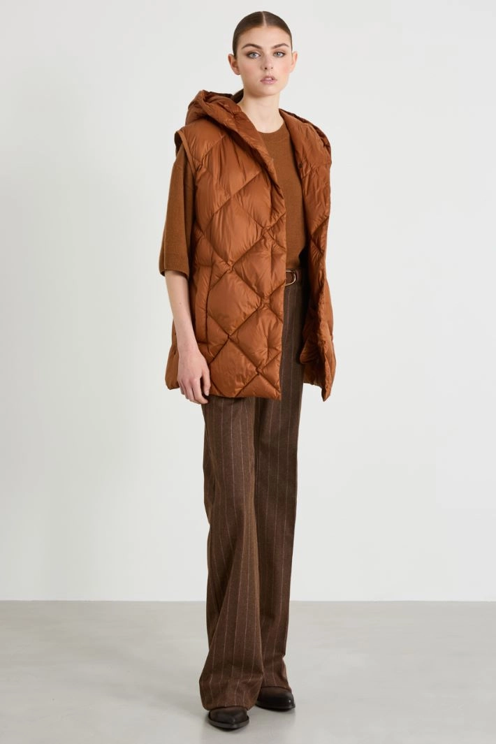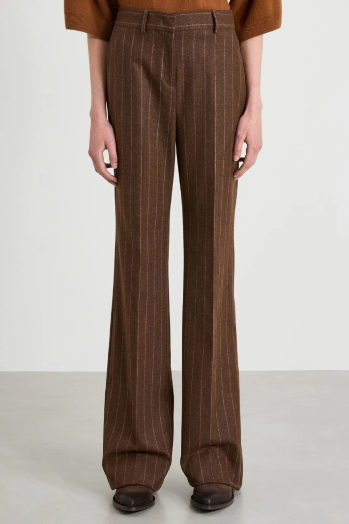 Flare trousers in yarn-dyed pinstriped wool blend flannel, with belt loops at the waist, side French pockets and welt pockets at the back, crease pressed lengthwise and hidden fastening with zip, button and hook.