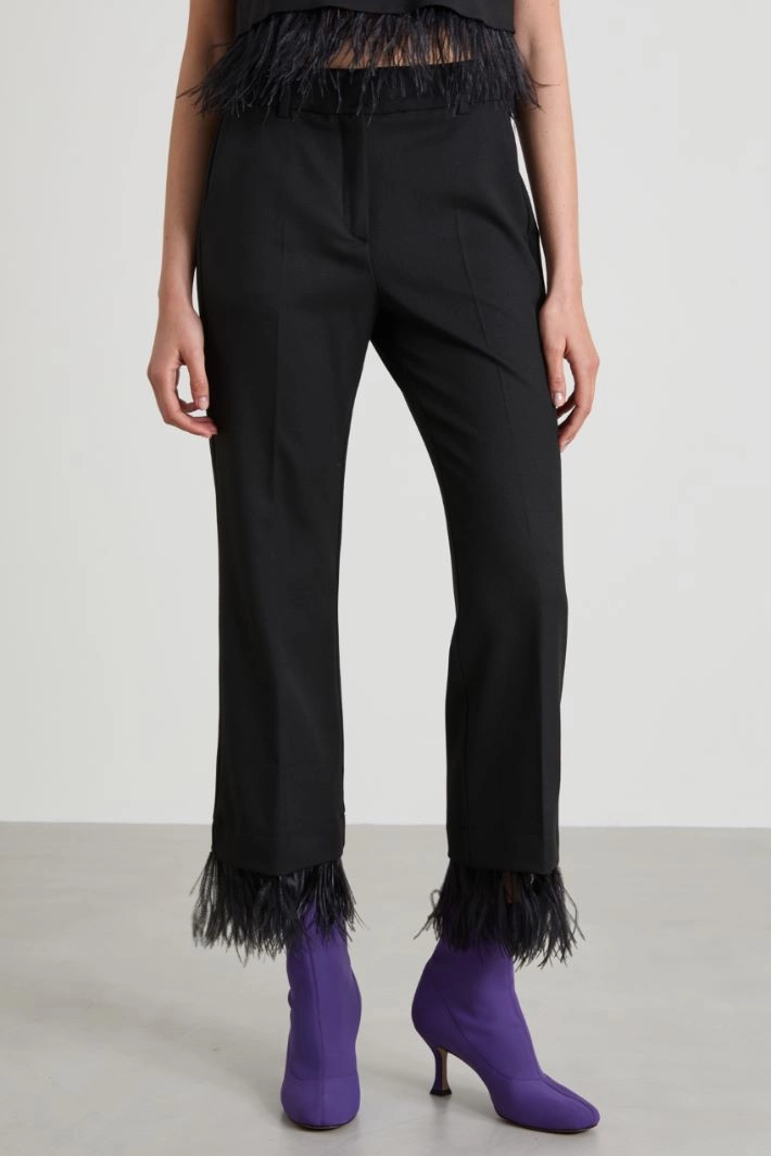 Straight-cut trousers in viscose-blend gabardine, with belt loops at the waist, French pockets at the front, welt pockets at the back, crease pressed lengthwise and removable feather detail at the bottom of the garment. Hidden fastening with zip, button and hook.