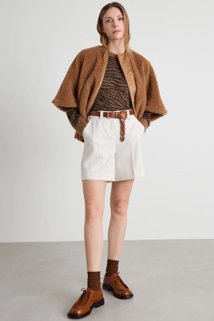 Shorts in lightweight stretch viscose blend flannel, with elastic waistband insert at the back, belt loops, side French pockets and welt pockets at the back, and pressed crease lengthwise. Hidden fastening with zip, button and hook.