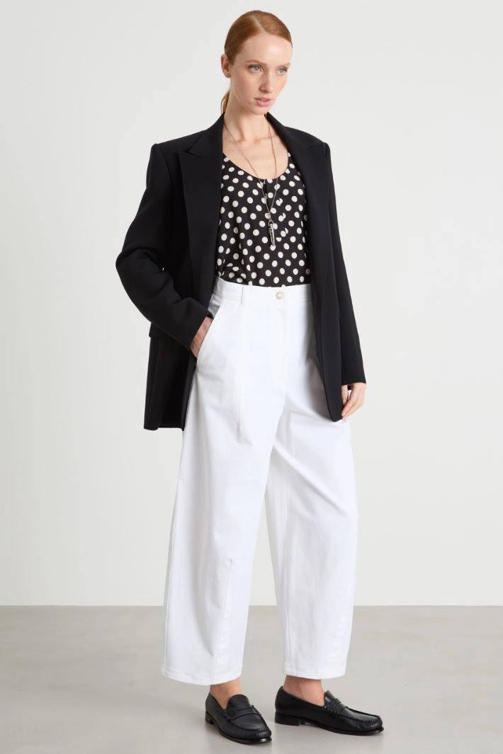 A fluid-fit top crafted from printed pure silk crepe de chine, featuring a round neckline and wide shoulder straps. The style is finished with side slits and a button fastening.