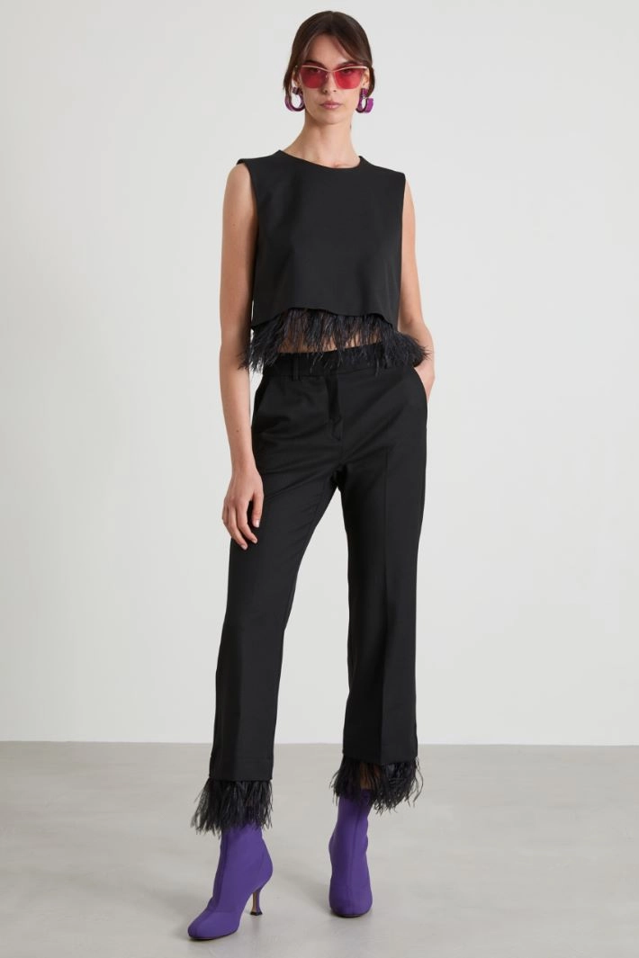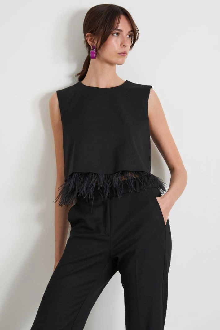 Straight-cut top in viscose-blend gabardine, with crew neck and removable feather detail at the bottom of the garment. Invisible zip fastening at the center back. Lined.