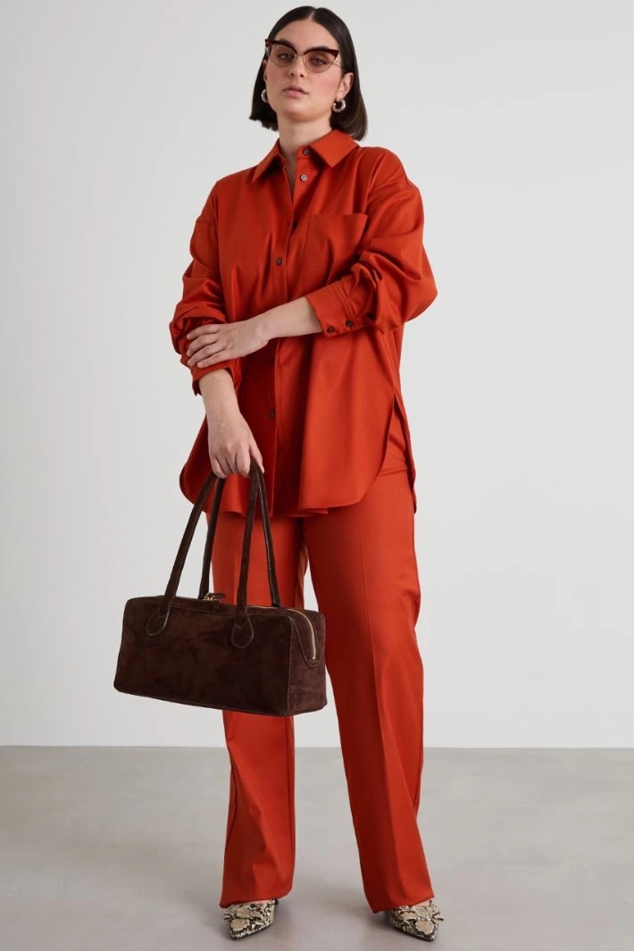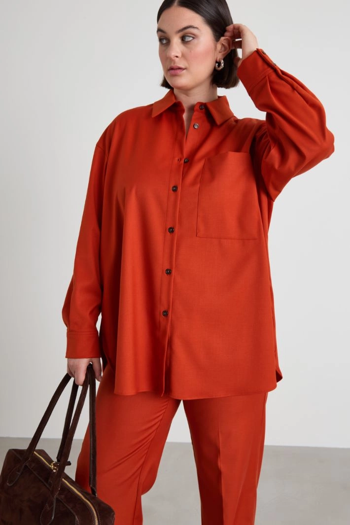 Straight-fit tunic in stretch viscose blend twill, with shirt collar, long sleeves with cuffs and buttons, and patch pocket on the chest. Button fastening.