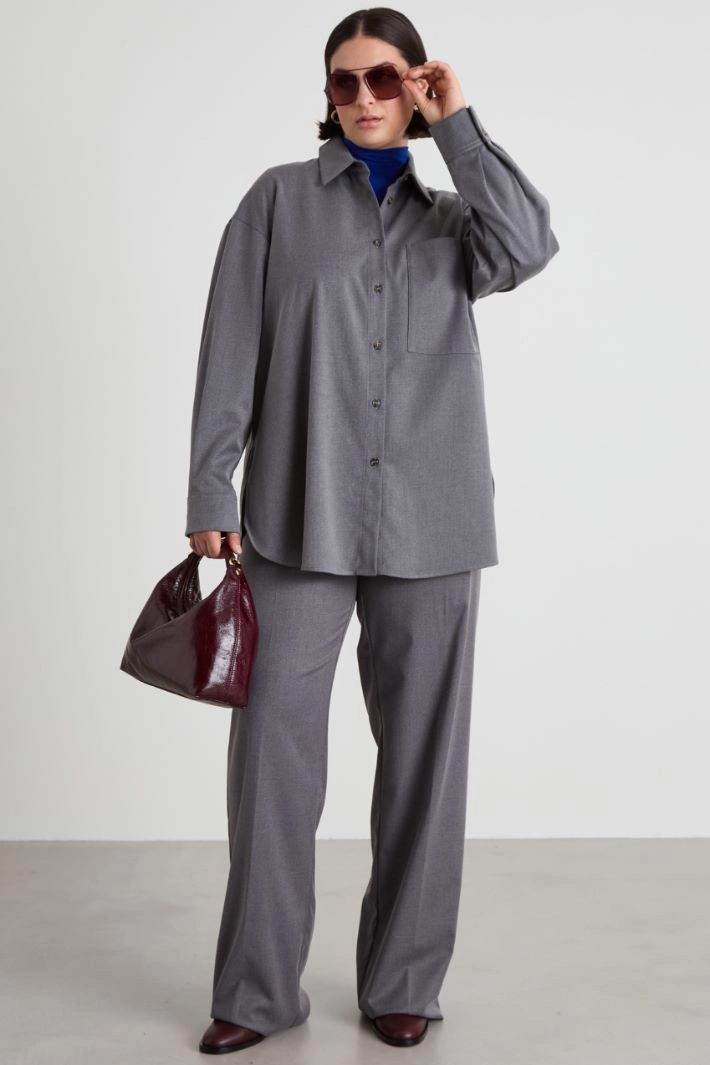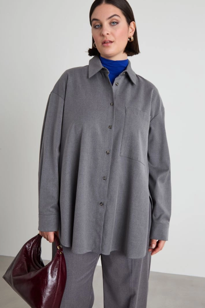 Straight-fit tunic in stretch viscose blend twill, with shirt collar, long sleeves with cuffs and buttons, and patch pocket on the chest. Button fastening.