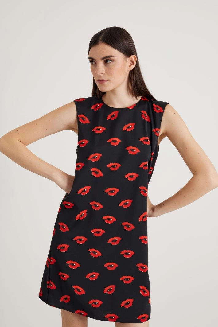 Flared dress in envers satin with a shiny finish printed all over with a crew neckline. Invisible zip fastening on the center back. Lined.