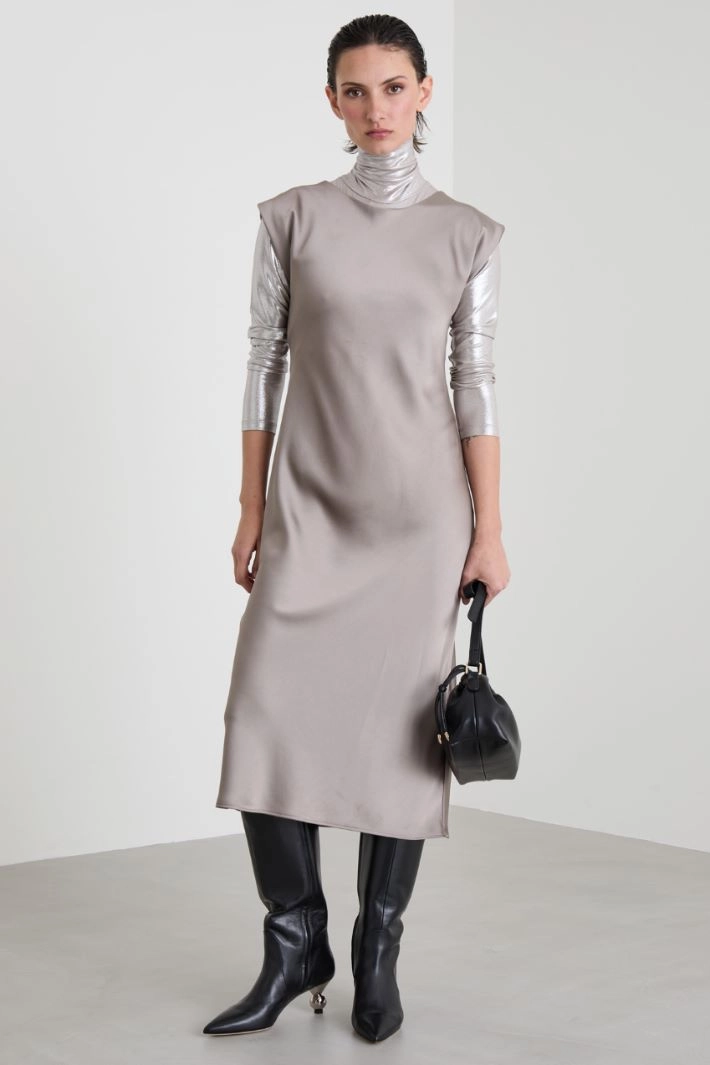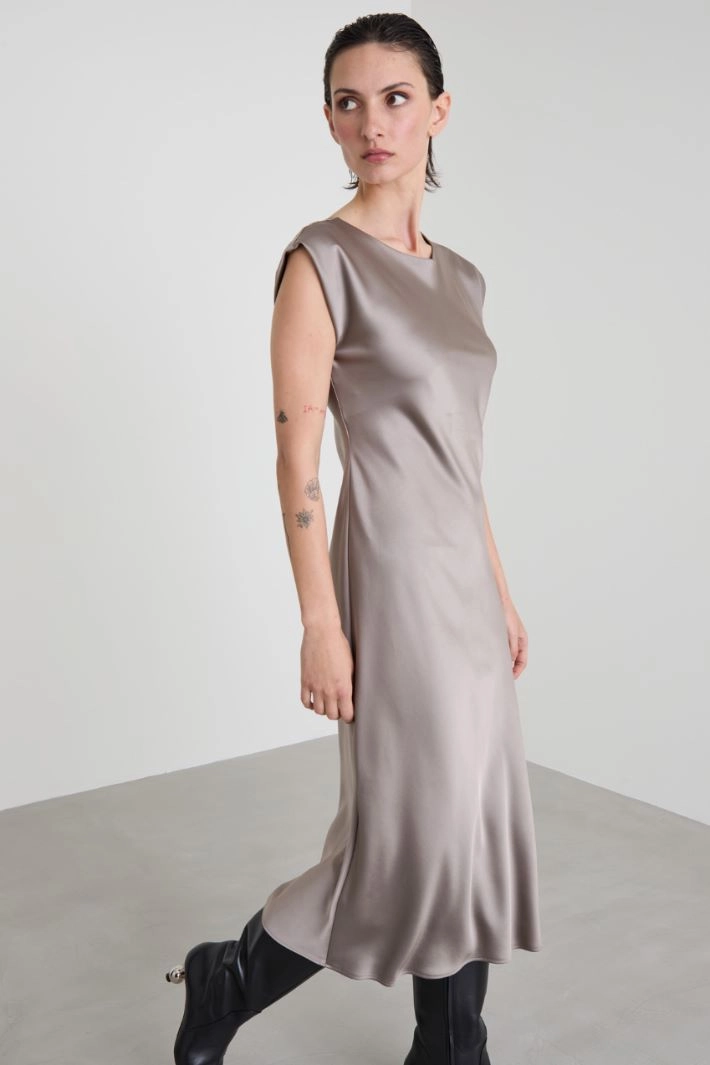 Loose-fit satin dress with a boat neckline on the front and a V-neck on the back, short sleeves with covered shoulders. Semi-lined garment.